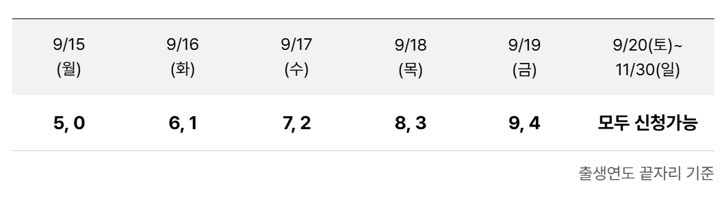 2025년 9월 15일부터 11월 30일까지예요. 원활한 신청을 위해 민생지원금 처럼 신청 첫 주간 출생연도 끝자리 기준 5부제 시행이니 해당 일자를 꼭 확인하세요!