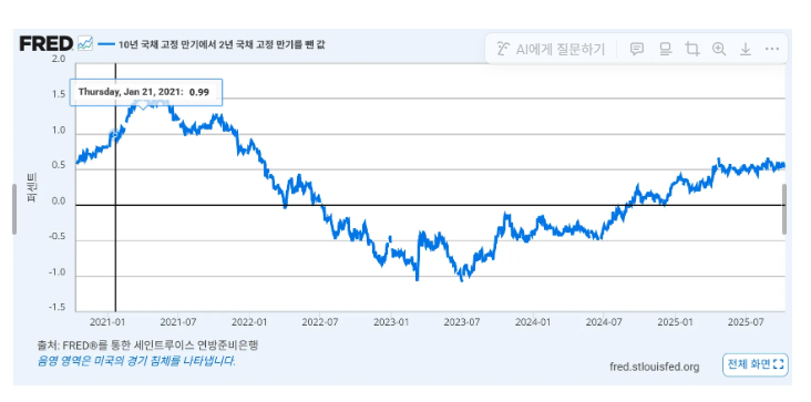 A. 미국 연준의 경제 데이터(FRED) 사이트에서 *“10-Year Treasury minus 2-Year Treasury”*로 검색하면 바로 볼 수 있어요.