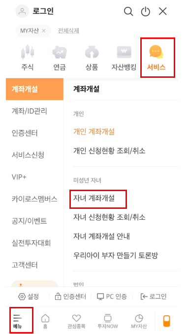 - 미래에셋증권 앱열기 → 메뉴→서비스 → 자녀 계좌개설