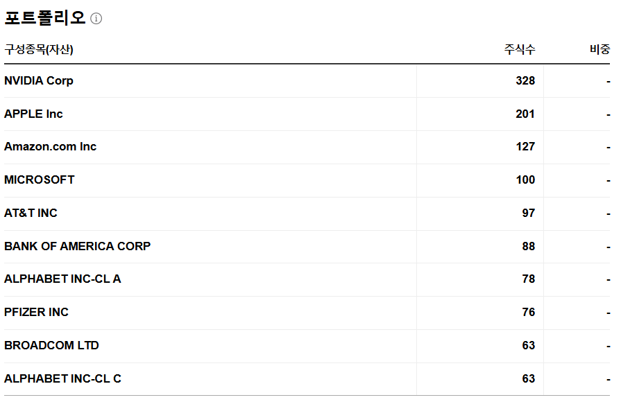 즉, 반도체(엔비디아), 빅테크(애플·마소·구글), 금융(BOA), 헬스케어(화이자) 등 미국 경제를 대표하는 핵심 섹터를 한꺼번에 담고 있습니다. 특히 최근 AI 열풍으로 엔비디아 비중이 크게 늘어나면서 성과를 끌어올린 점이 눈에 띕니다.