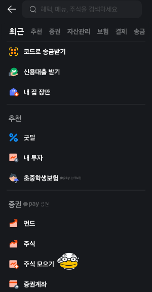 ▶ 카카오톡에서 증권계좌만들기: [카카오톡 → 더보기 →pay →계좌로업그레이드]